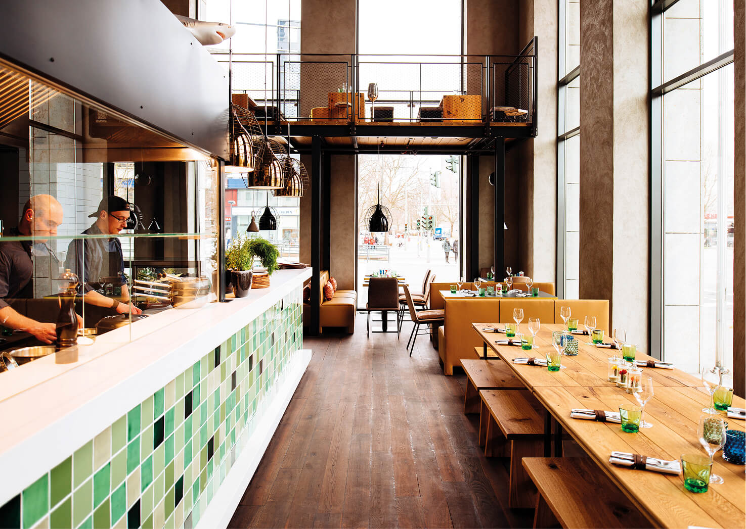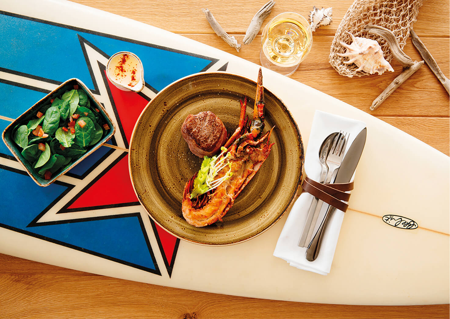 Die Küche verspricht kalifornische Gaumenkicks samt Einflüssen aus Asien, Mexiko und Pacific Rim, mit klangvollen Namen wie Mavericks Roll, Fake Sushi Bowl sowie ein frischer ‚Catch of the Day‘. Kurz: kreatives kalifornisches Essen, serviert als abenteuerliche Menüs. Dazu eine feine Auswahl an kalifornischen Rebsorten und ein unverwechselbarer Look, mit einer Verbindung aus Holz, knalligen Farben und industriellem Schick aus Messing und Stahl auf drei Ebenen.